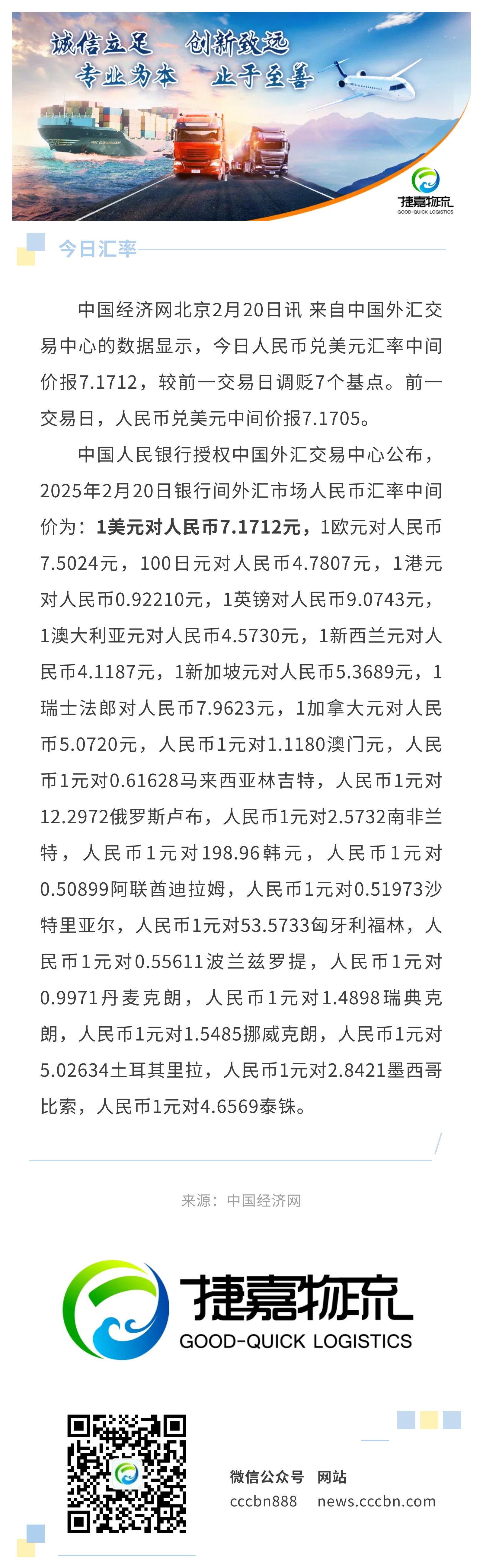 2月20日人民币兑美元中间价报7.1712,调贬7个基点