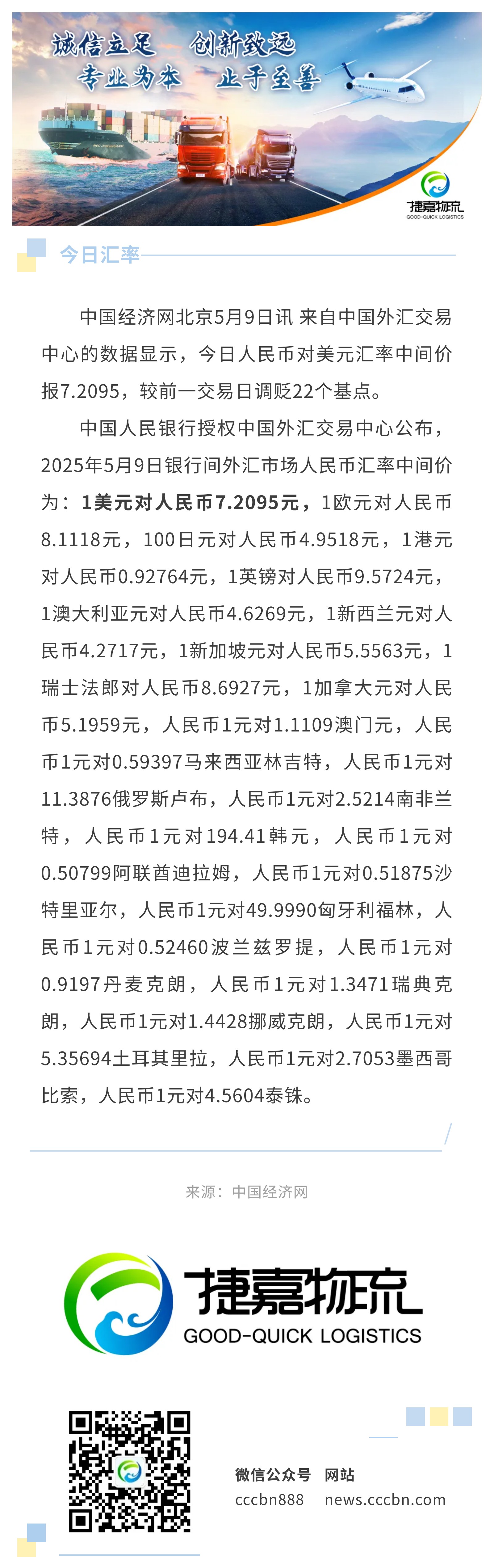 5月9日人民币兑美元中间价报7.2095,调贬22个基点