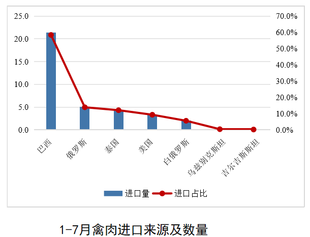 由图6可知,智利和中国的肉鸡出口量均有较大幅度上升,增长率分别为28.57%和22.74%;土耳其的肉鸡出口量出现大幅度下降,较 2023年下降27.02%。