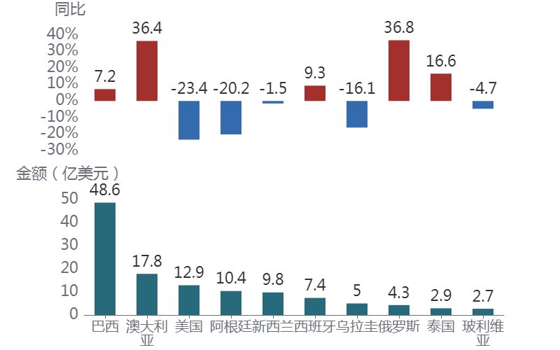 前7个月,巴西是我国肉类及制品进口最主要的市场,进口额为48.6亿美元,同比增长7.2%。7月当月,进口额为8.2亿美元,同比增长24.5%。