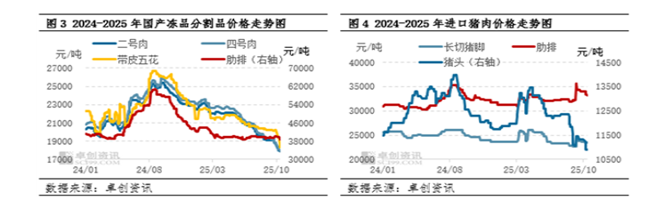 伴随着鲜品猪肉价格持续下降,冻品猪肉价格优势不断削弱,部分产品甚至产生“倒挂”现象,屠宰企业存降价走量的操作,国产冻品价格亦跟随下调;但在国储订单及部分食品加工厂因原料价低而增加冻品订单的支撑下,国产冻品猪肉价格跌幅不及鲜品。据卓创资讯统计,截至2025年10月14日,国产冻品二号肉成交均价为17875元/吨,冻四号肉成交均价为17913元/吨,冻带皮五花成交均价为18306元/吨,冻肋排成交均价38786元/吨,半月内累计跌幅分别为4.19%、4.47%、9.35%、3.21%。与此同时,进口商普遍库存压力较小,且从关税调整因素考虑对后市存一定乐观预期,多挺价观望,导致进口产品价格跌幅较小,市场成交寡淡,部分产品处于有价无市的状态。据卓创资讯统计,截至2025年10月14日,进口猪头成交均价为10917元/吨,长切猪脚成交均价为23433元/吨,肋排成交均价33217元/吨,半月内累计跌幅分别为3.53%、0.71%、2.45%。