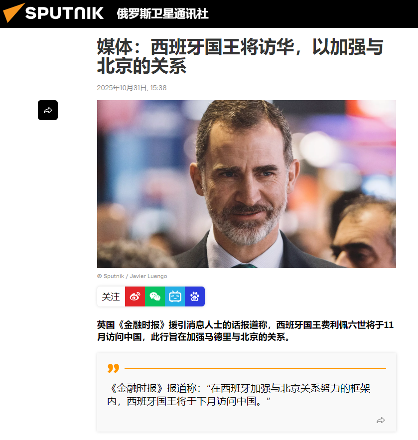 需要说明的是,关于西班牙国王访华的消息,目前主要来源于俄罗斯的《俄罗斯卫星通讯社》等外媒的报道,而国内官方尚未发布确切消息。