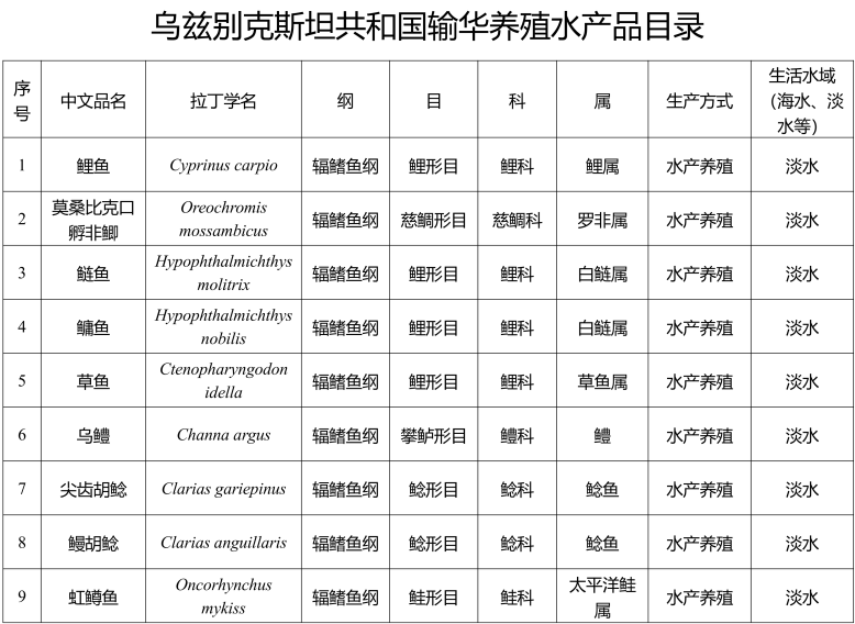 根据我国法律法规和中华人民共和国海关总署(以下称中方)与乌兹别克斯坦共和国农业部(以下称乌方)有关乌兹别克斯坦输华养殖水产品的检验检疫和兽医卫生要求规定,即日起,允许符合以下相关要求的乌兹别克斯坦养殖水产品进口: