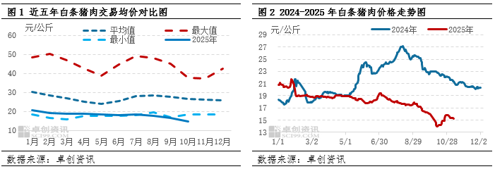 从近五年白条猪肉交易价格对比图中可以看出,2025年1-10月份白条猪肉价格处于近五年平均值以下,接近最小值水平,甚至突破最小值,创近五年月均值新低。2024年猪肉价格冲高,2025年上半年低位偏弱震荡。从图2可以看出,2024年白条猪肉价格最高值为8月份的27.17元/公斤,最低值为1月份的17.57元/公斤,价差为9.6元/公斤;而2025年白条猪肉价格最高值为1月份的21.57元/公斤,最小值为10月份13.98元/公斤,价差7.59元/公斤。猪肉价格创新低,且处五年内低位,主要是因为猪肉产量增加明显。