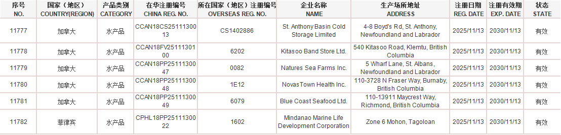 1.海关总署新增加拿大5家水产品企业输华注册(注册编码为:CS1402886、6202、0082、1E12、6079)自2025年11月13日及之后生产的符合中国要求的水产品允许输华。