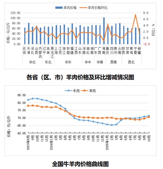 据对全国500个县集贸市场和采集点的监测,2025年10月份,牛肉、肉羊、生鲜乳价格环比上涨,生猪产品、鸡蛋、商品代雏鸡、鸡肉、活牛、饲料产品价格环比下降。按集贸市场监测口径,本月猪粮比价为5.11:1,比上月下跌0.44个点。