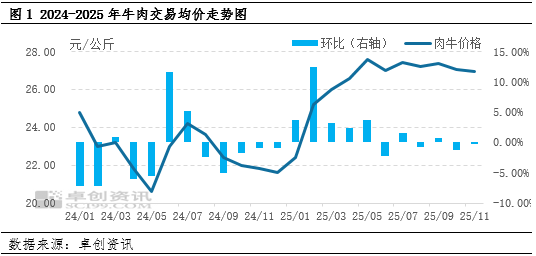进入四季度,全国肉牛价格走势打破持续上涨趋势,呈现反季节性回落。一方面,10月恰逢季节性出栏高峰,国内肉牛供应持续增加,叠加进口牛肉到港量居高不下,市场面临双重供应压力;另一方面,传统消费旺季的整体提振力度不及预期,供需阶段性失衡导致肉牛价格承压运行。据卓创资讯监测数据显示,截至11月14日,国内西门塔尔肉牛交易价格为26.96元/公斤,环比下降0.33%,同比上涨23.67%。消费旺季下,此次10-11月的价格回调,反映出短期市场供需格局正在发生转变。