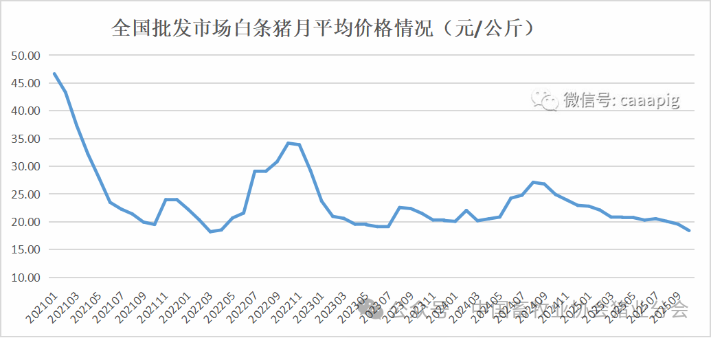 4、2025年10月份全国批发市场白条猪价格18.41元/公斤,环比下跌5.9%,同比下跌26.1%。