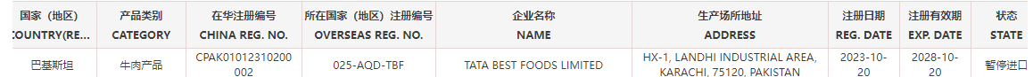 暂停受理巴基斯坦1家牛肉产品(注册编码为:025-AQD-TBF)自2025年11月29日(含)起启运的输华产品进口申报。
