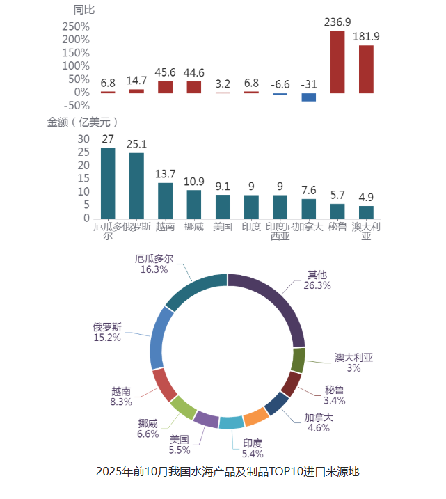 市场方面,前10个月,我国水海产品及制品进口额排名前十的国家/地区分别为厄瓜多尔、俄罗斯、越南、挪威、美国、印度、印度尼西亚、加拿大、秘鲁、澳大利亚,合计占我国该产品进口额的73.7%。