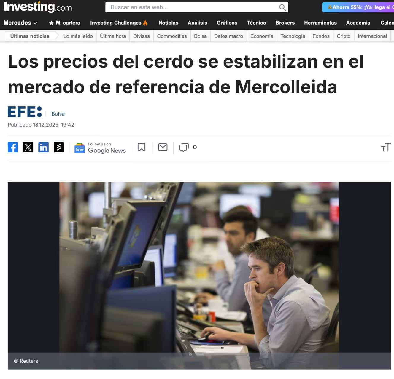 西班牙生猪价格在非洲猪瘟疫情后首度止跌企稳。12月18日,主要定价市场Mercolleida决定维持当前价格,优选级育肥猪保持在每公斤1.052欧元。