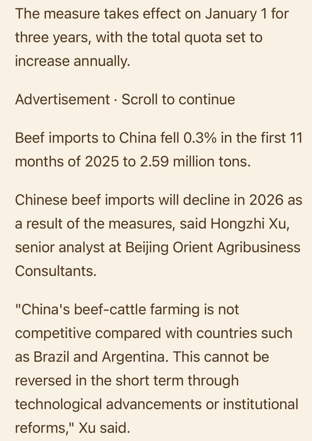 除巴西外,阿根廷、乌拉圭、澳大利亚等主要供应国均将受到配额管理。巴西政府表示已关注该政策,将通过双边与WTO渠道与中方沟通。行业分析指出,55%的关税将使配额外出口在经济上难以持续,同时后续进口监管与信贷政策若收紧,可能进一步影响贸易流动。