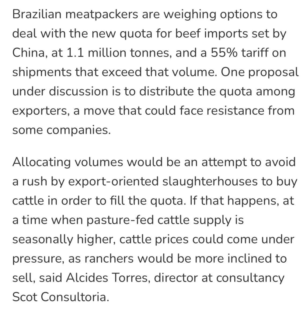 此外,巴西希望在中方允许下,承接阿根廷、乌拉圭等其他供应国未用完的配额。巴西农业部已表示将通过对话推进此事,并强调巴西牛肉具备价格与品质优势,有助于平抑中国国内通胀。目前巴西暂不考虑向世贸组织提起诉讼,倾向于以协商方式处理配额相关事宜。