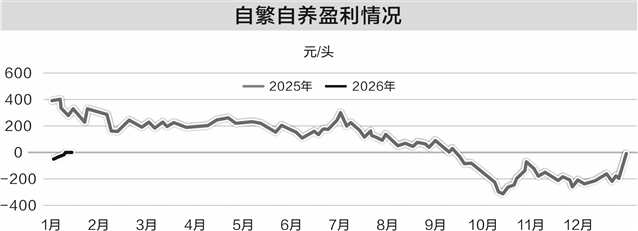 卓创资讯生猪分析师邹莹吉则表示,虽然2026年1月上旬生猪价格偏强运行,支撑养殖端亏损幅度收窄,但截至1月9日,卓创资讯监测1月上旬生猪自繁自养每头平均仍亏损33元左右,仅较去年12月份均值减亏150元左右。