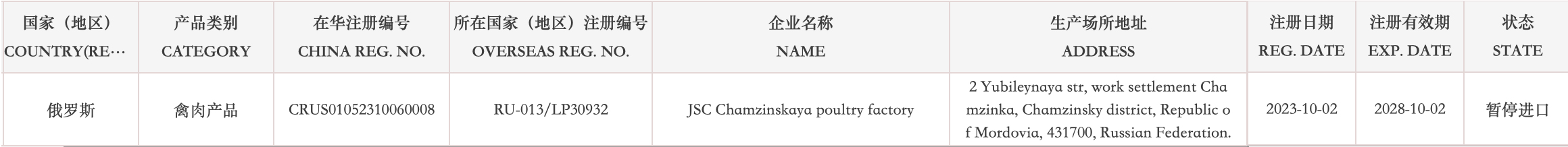 暂停受理俄罗斯1家禽肉企业(注册编码为:RU-013/LP30932)自2026年1月16日(含)起启运的输华产品进口申报。