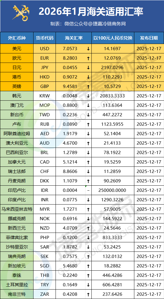 2026年1月海关汇率(对比)