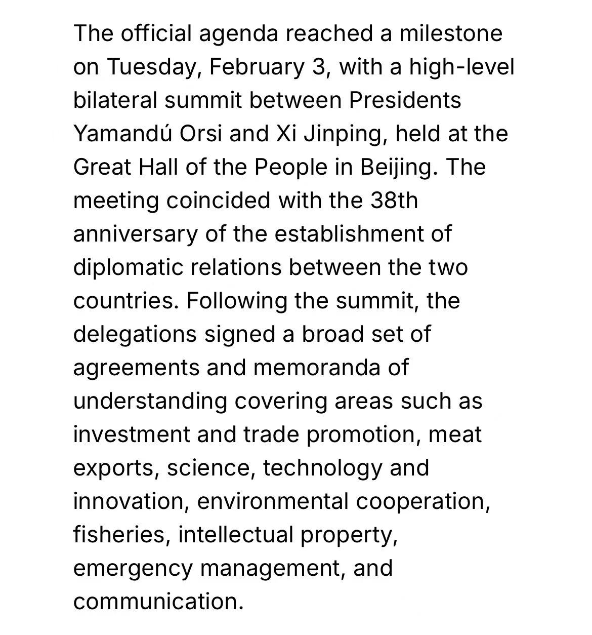 2026年2月1日至7日,乌拉圭总统亚曼杜·奥尔西率团对中国进行正式访问,旨在推动两国关系迈向新高度。此次访问的核心成果体现在2月3日与中国国家主席习近平的高层会晤中,双方签署了一系列涵盖广泛领域的合作协议,其中农牧渔业成为深化务实合作的重点。