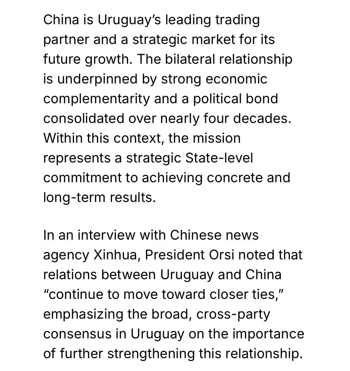 此次访问还涉及贸易、投资、科技与环保等多领域合作,凸显中国作为乌拉圭最大贸易伙伴的战略重要性。双方同意在绿色发展、数字经济等领域挖掘新机遇,进一步强化全面战略伙伴关系,为乌拉圭的国际融合与可持续发展注入动力。