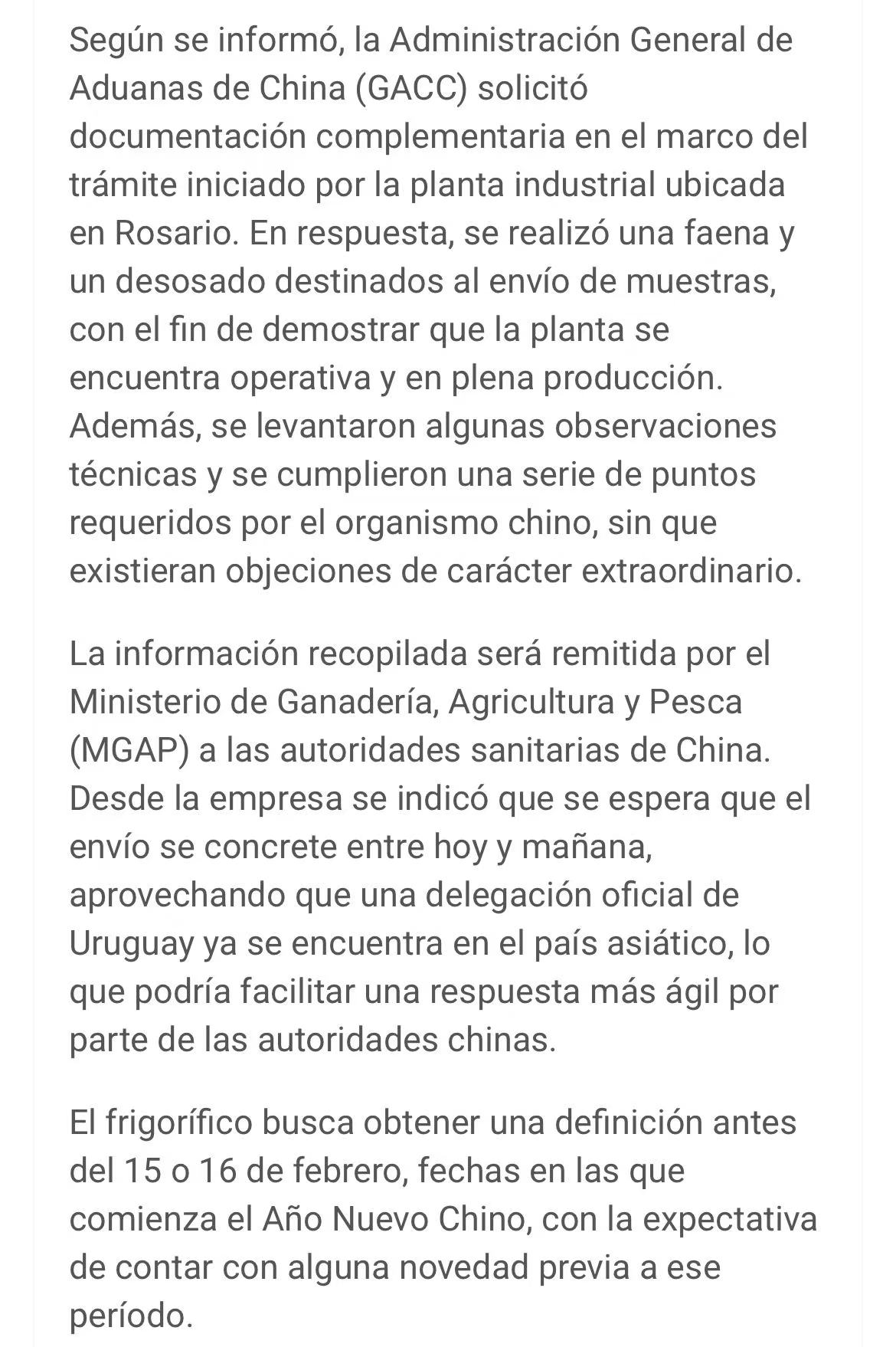乌拉圭肉类加工企业Frigorífico Rosario(Rondatel S.A.)——22厂,正加紧推进对华出口准入程序,已按中方要求补充提交相关文件及生产样品,以期在农历新年前获准向中国出口牛肉。