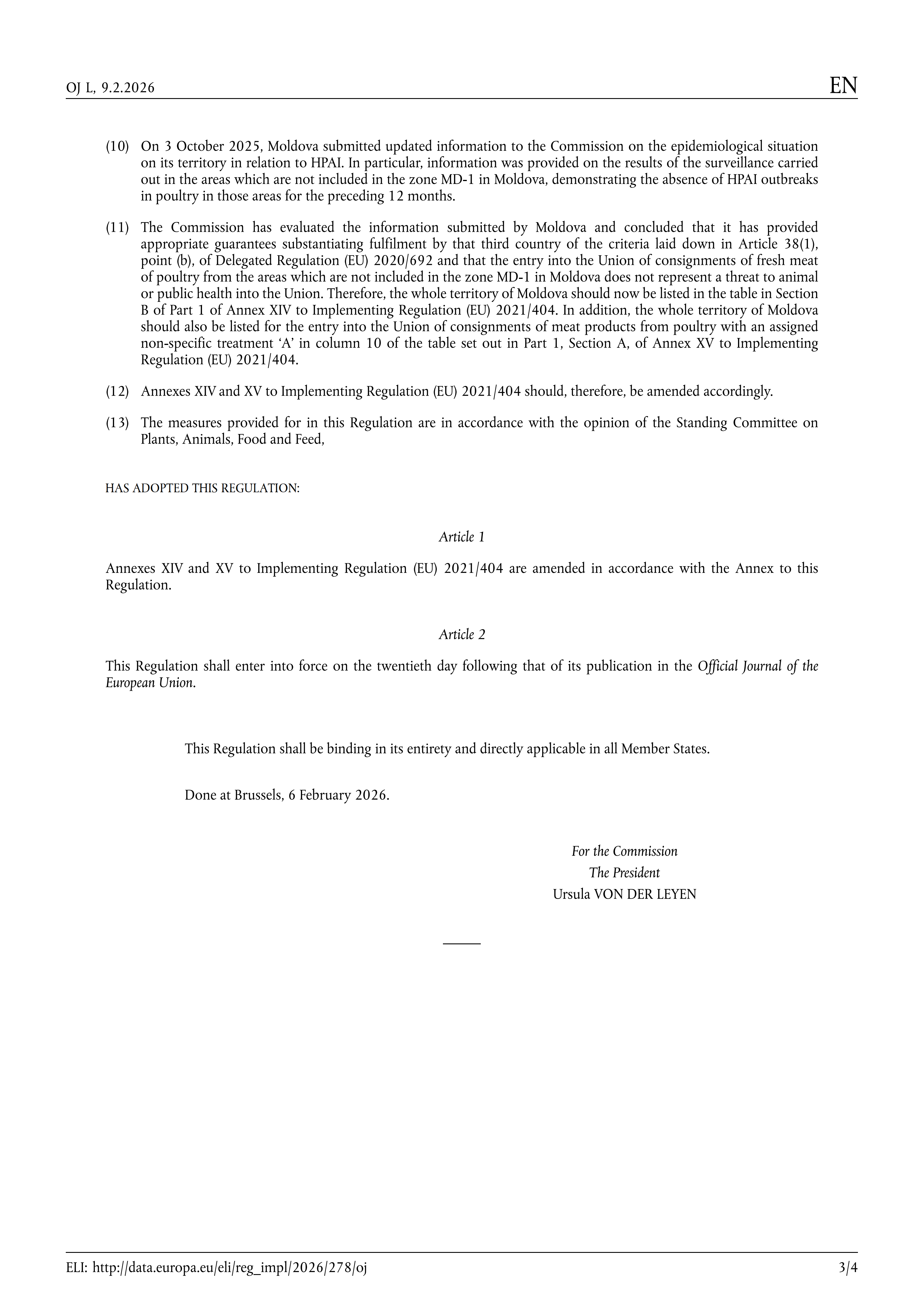 根据欧盟官方2月9日公布的法规(EU) 2026/278,欧盟已正式恢复阿根廷禽肉及其制品的进口资格。新规将于3月1日起生效。