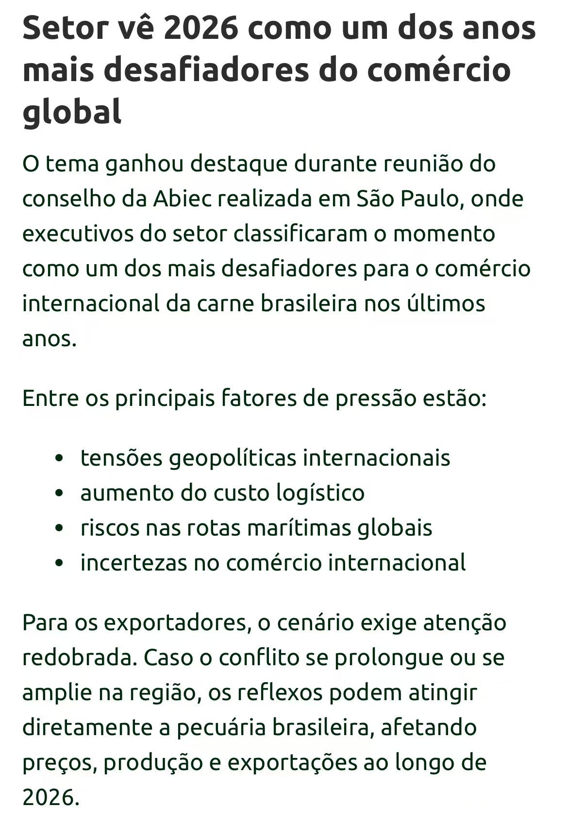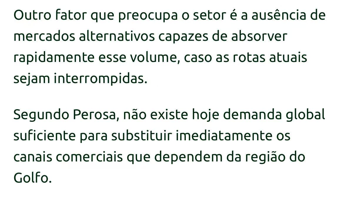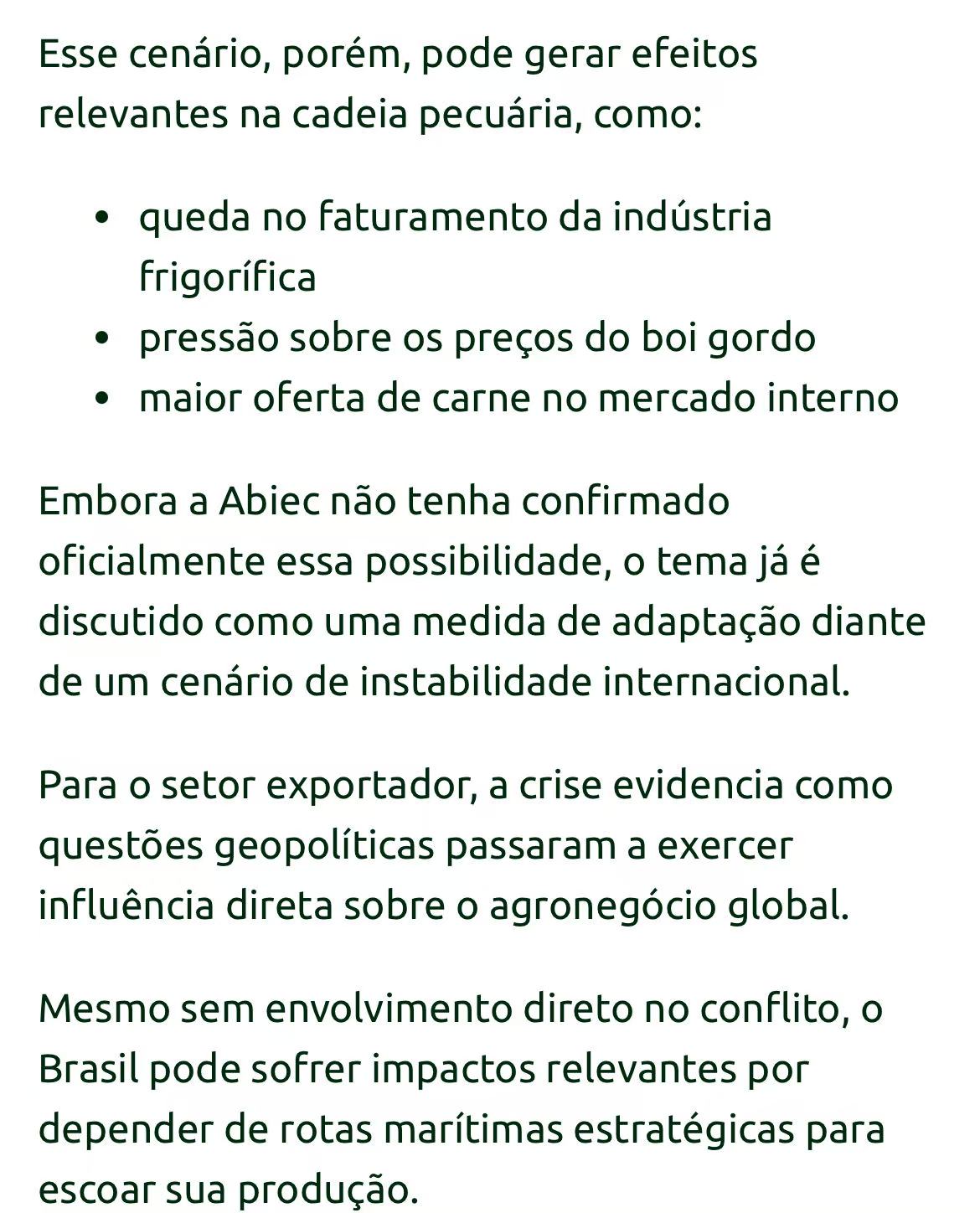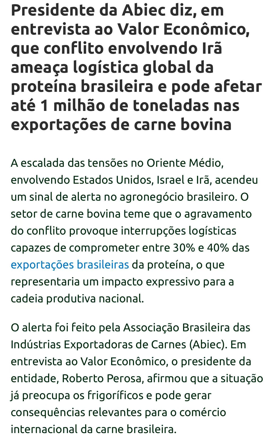 巴西肉类出口商协会(Abiec)主席佩罗萨警告说,美国、以色列与伊朗的冲突,可能影响到巴西30%到40%的牛肉出口。
