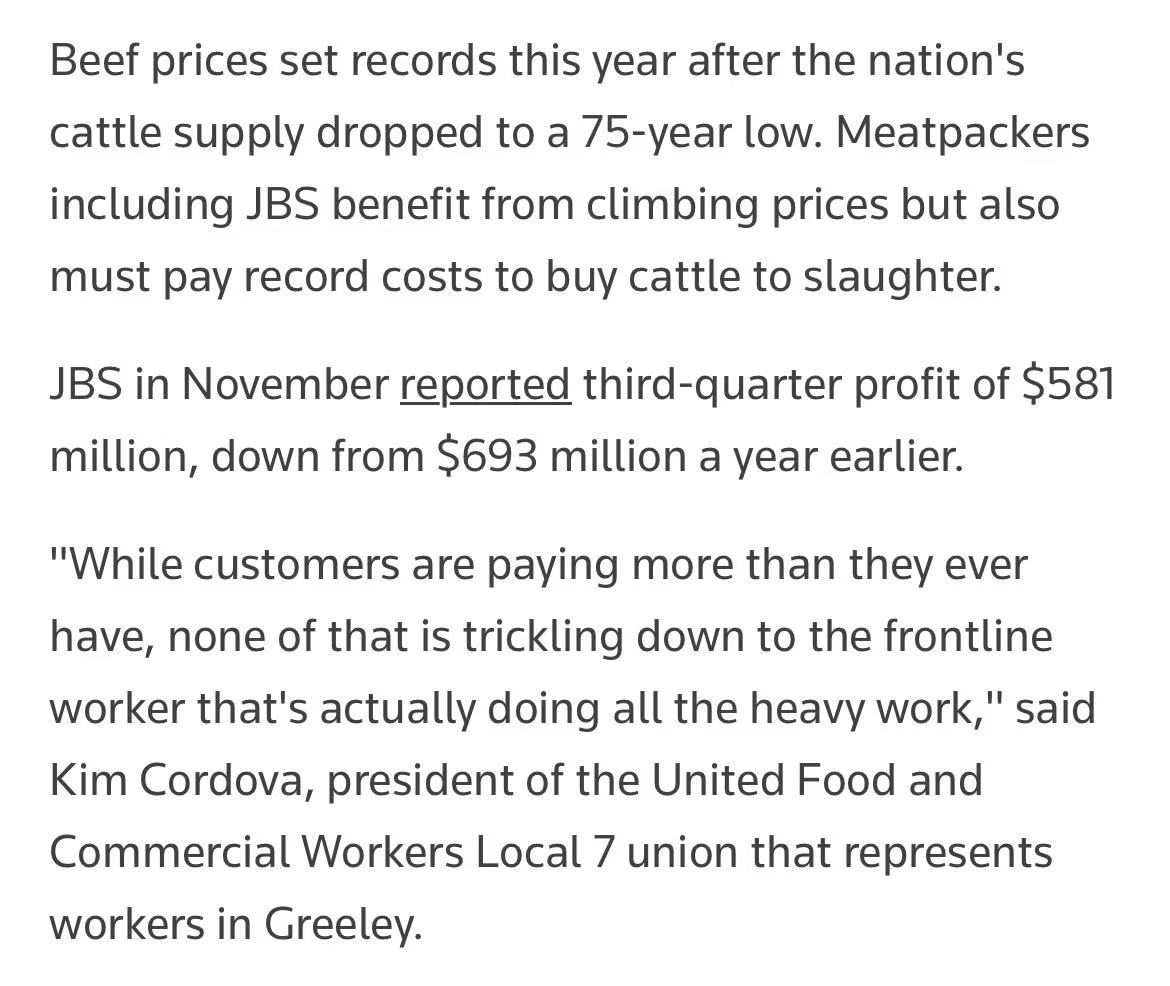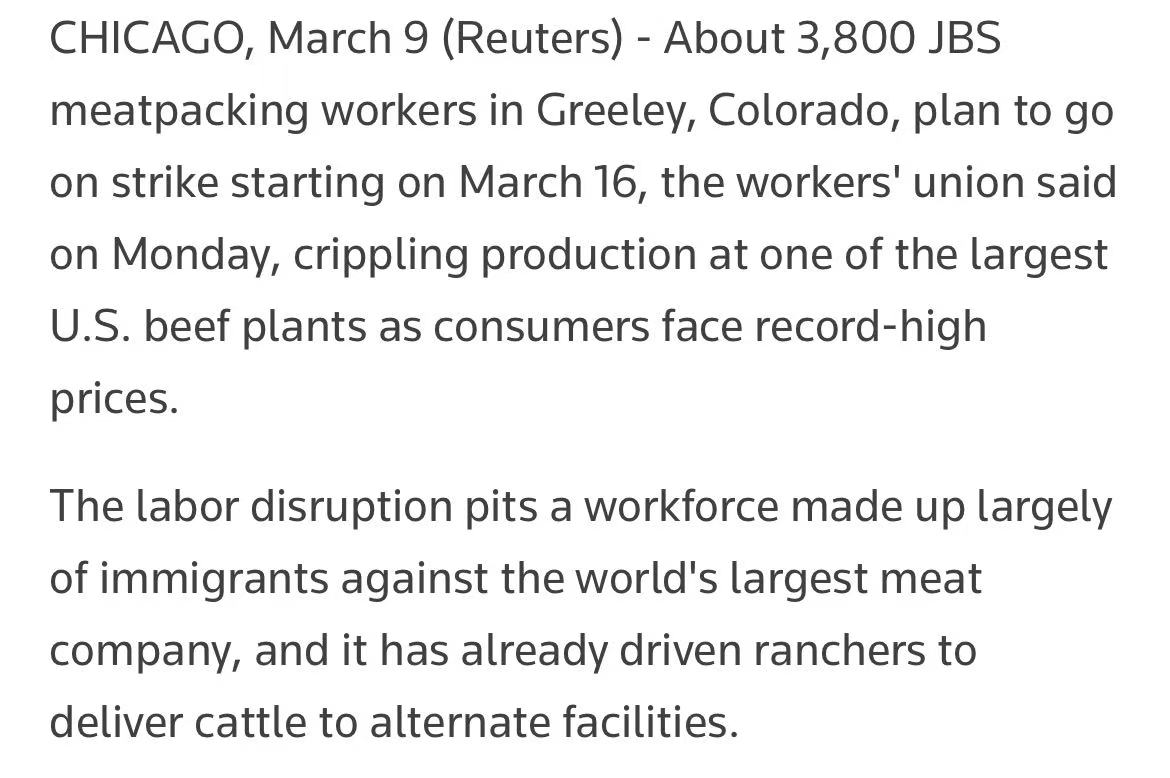 约3800名工人计划从3月16日起在JBS格里利工厂罢工,劳资谈判已僵持8个月。工会称工资跟不上通胀,JBS则表示方案公平,已准备将产能转移至其他工厂。