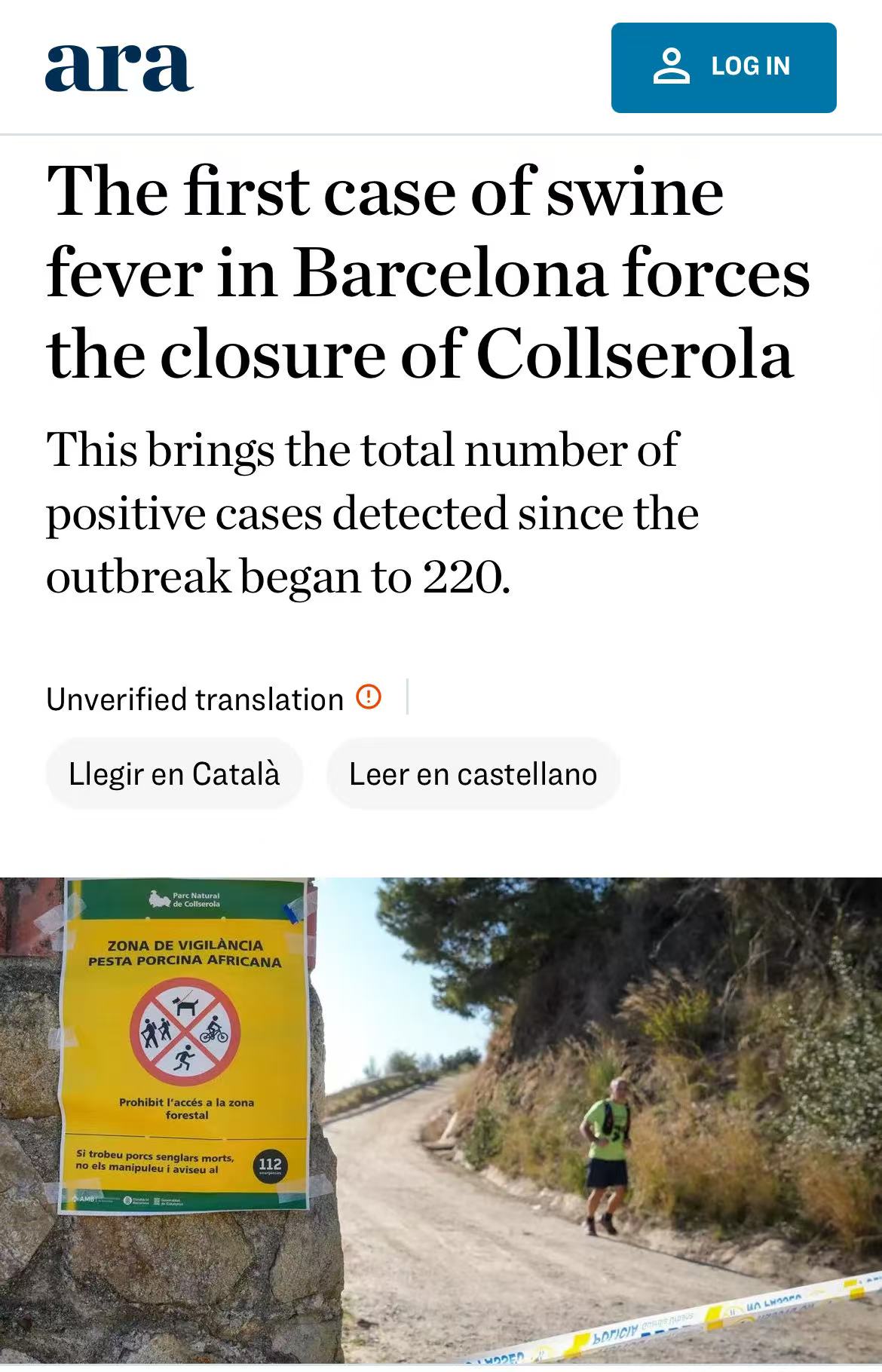 加泰罗尼亚农业部长确认,在巴塞罗那市辖区内检测到首例感染野猪,该病例将于明日纳入官方统计。至此,自疫情暴发以来累计检测阳性野猪已达220例。