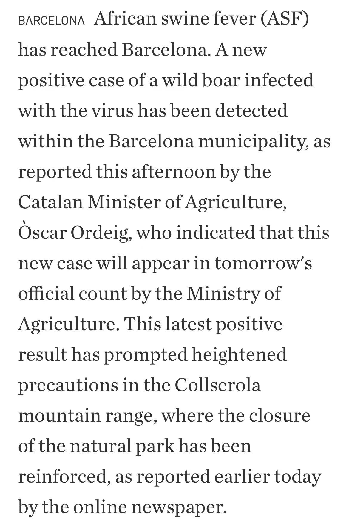 据外媒消息:非洲猪瘟已抵达巴塞罗那市区。