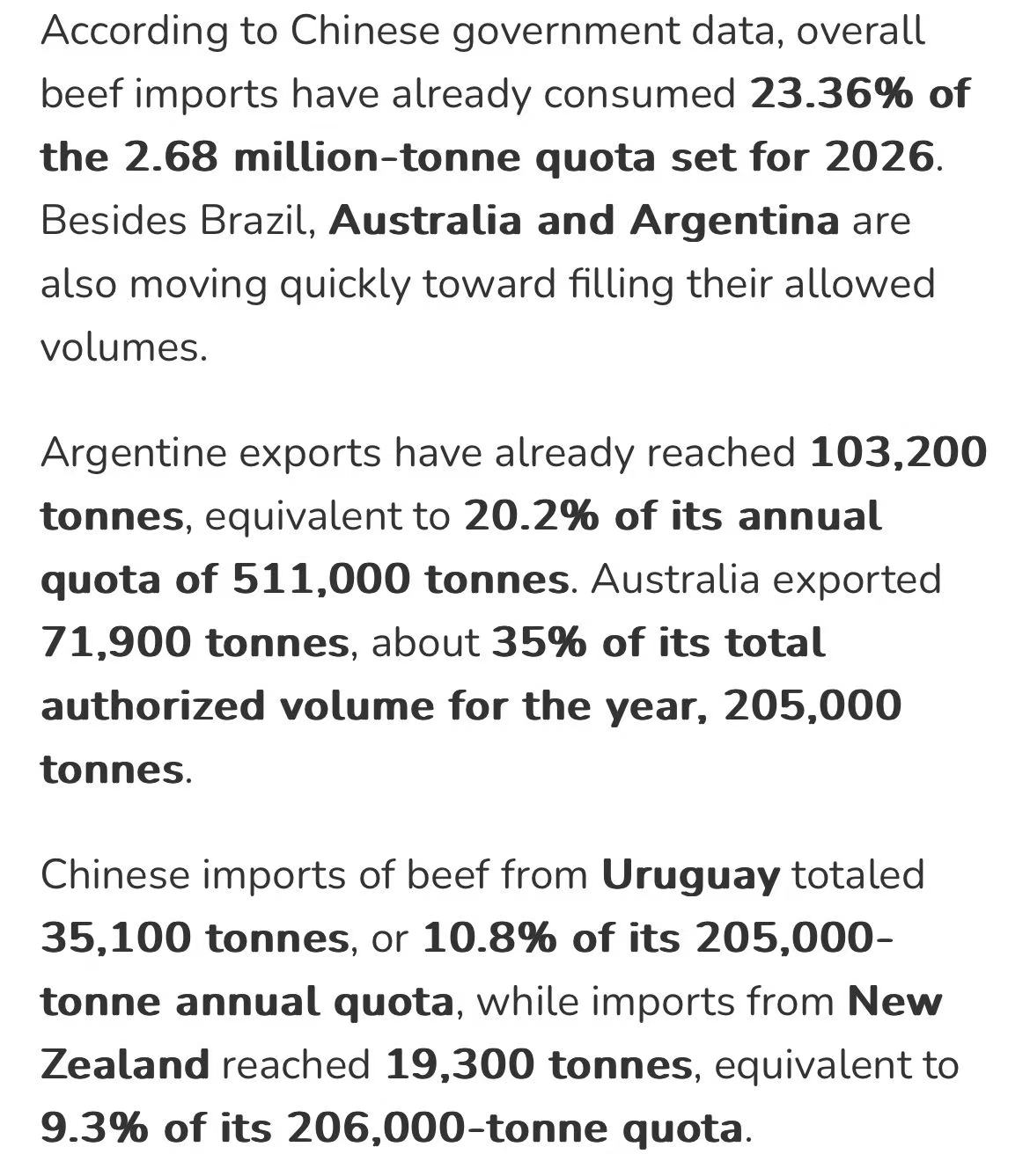 阿根廷、澳大利亚配额消耗速度同样较快,前两月分别用掉20.2%和约35%。乌拉圭(10.8%)和新西兰(9.3%)相对平稳,美国则因贸易停滞仅使用0.2%。