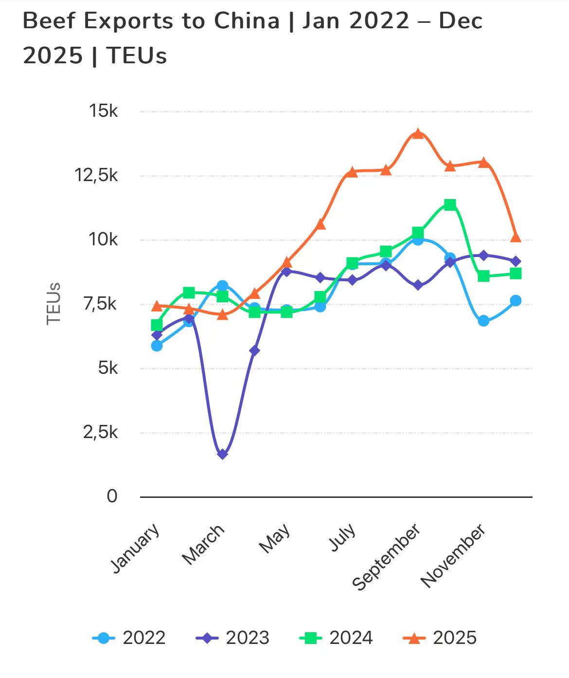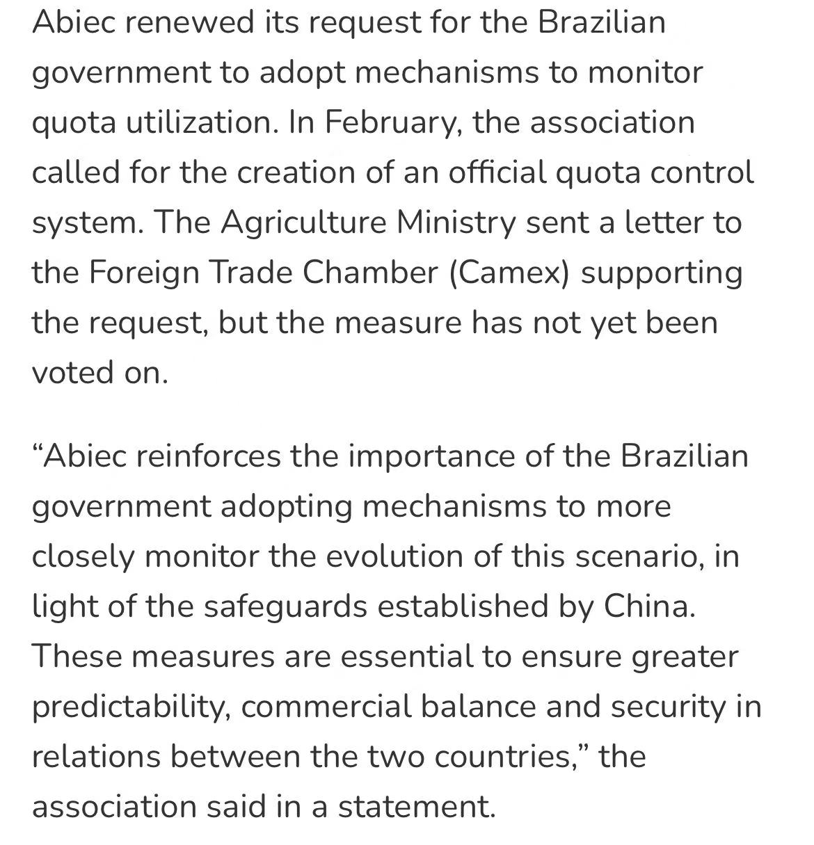 ABIEC表示,配额使用速度过快“为全年出口表现敲响警钟”,呼吁巴西政府建立官方配额管控机制,包括按企业过往份额分配、季度发放、月度监测等建议,以避免前期集中发货、后期无货可发的局面。