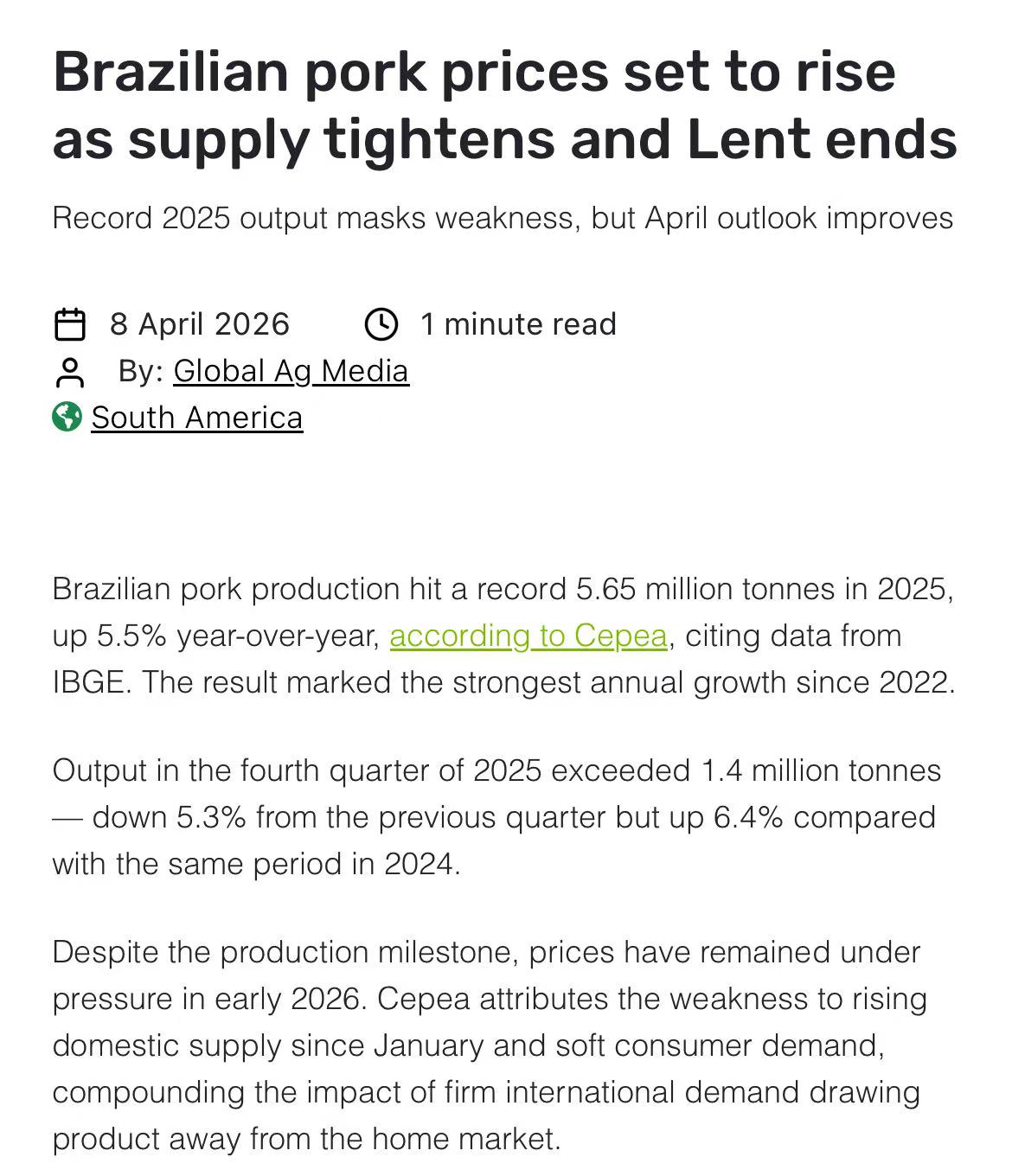 2025年巴西猪肉产量创纪录,达565万吨(同比+5.5%),为2022年以来最高。但高供给叠加国内需求疲软,导致2026年初价格持续承压。