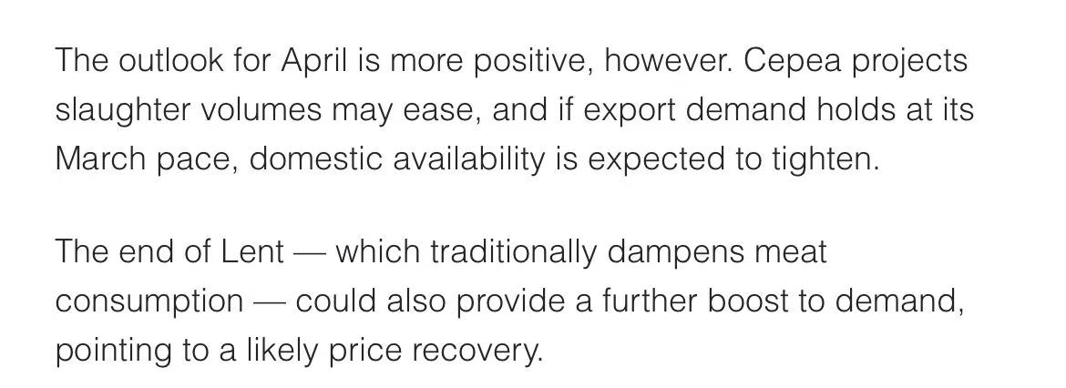 若3月的强劲出口需求能维持,价格上行概率较大。Cepea预计,4月巴西猪肉价格将迎来上涨。