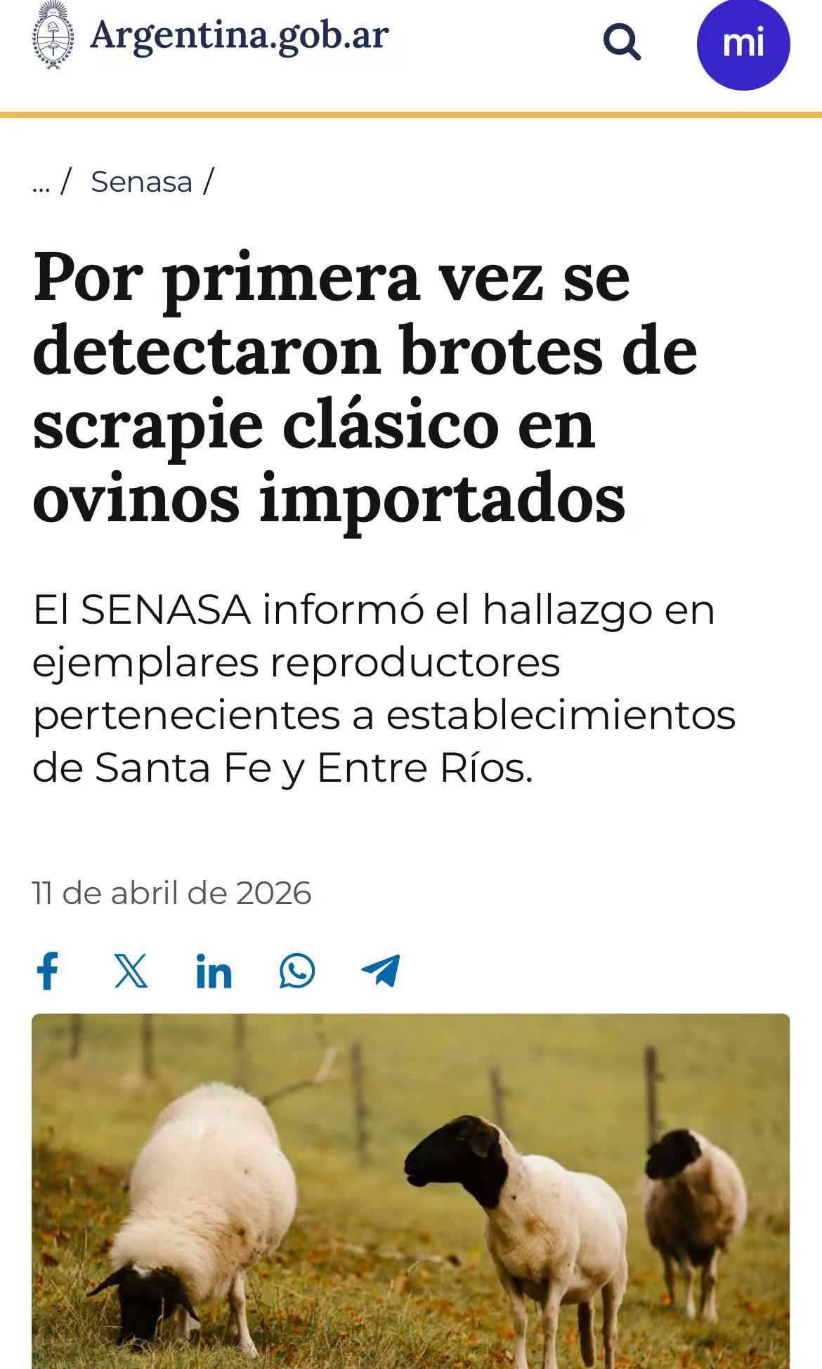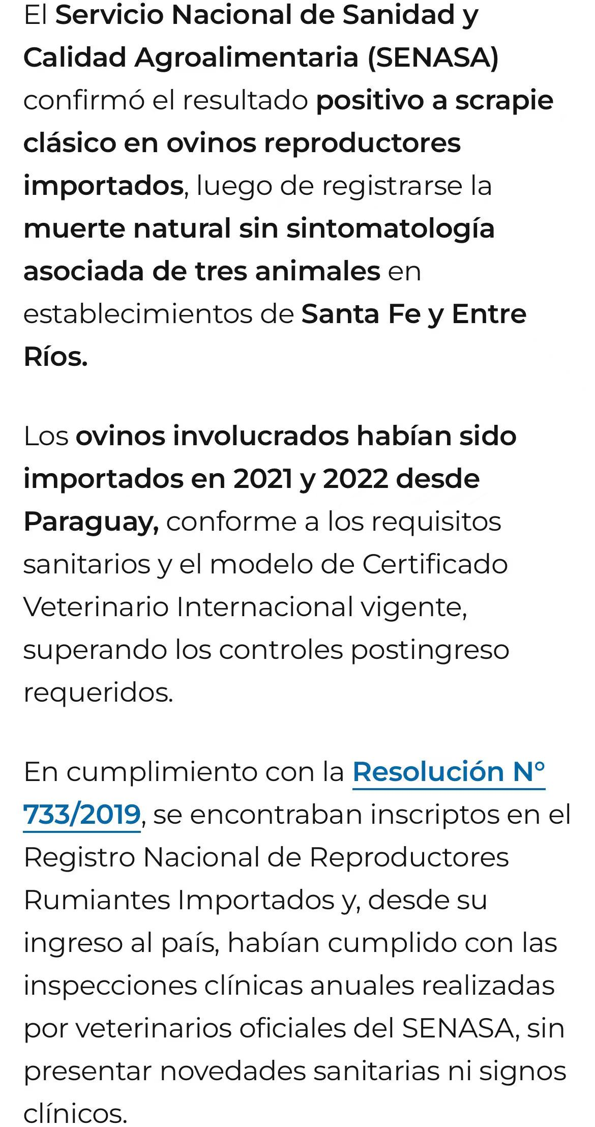 阿根廷国家农业食品质量与卫生局(Senasa)近日确认,在圣菲省和恩特雷里奥斯省的进口种用绵羊中检测出经典痒病(Scrapie)阳性病例。这是阿根廷首次报告该疫情。
