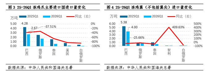 具体来看,2026年一季度国内鸡肉进口总量虽呈逐月回升态势,但整体同比降幅仍十分显著。从结构性数据来看,核心进口品类冻鸡翼(不含翼尖)、冻鸡爪一季度进口量分别为5.49万吨、5.36万吨,同比跌幅达25.73%和45.87%。结合进口来源国数据进一步分析:冻鸡爪方面,巴西进口量虽回升至2.67万吨,但同比仍下滑37.51%,俄罗斯、泰国进口量同比分别下降32.27%、64.89%;冻鸡翼方面,巴西进口量回升至4万吨,同比跌幅25.66%,俄罗斯、泰国进口量同比分别下降15.29%、45.12%。相比之下,智利一季度进口量虽仅0.14万吨,但同比增幅高达409.63%,成为进口市场中增长最快的来源国。但2026年3月下旬,受智利再次爆发禽流感影响,海关总署再次暂停所有智利禽肉企业输华申报,进口通道再度关闭。这也导致2026年一季度智利鸡肉进口量仅0.14万吨,虽因低基数呈现409.63%的同比增幅,但已不具备长期供应补充的能力。