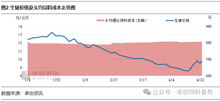 从头均饲料成本来看,截至4月23日,头均理论饲料成本均值879.27元,最小值869.80元/头,最高值887.54元/头,与年均值差距微小。从图2中的走势及数据来看,进入2026年后头均理论饲料成本变动较小,对养殖利润的影响度较弱。