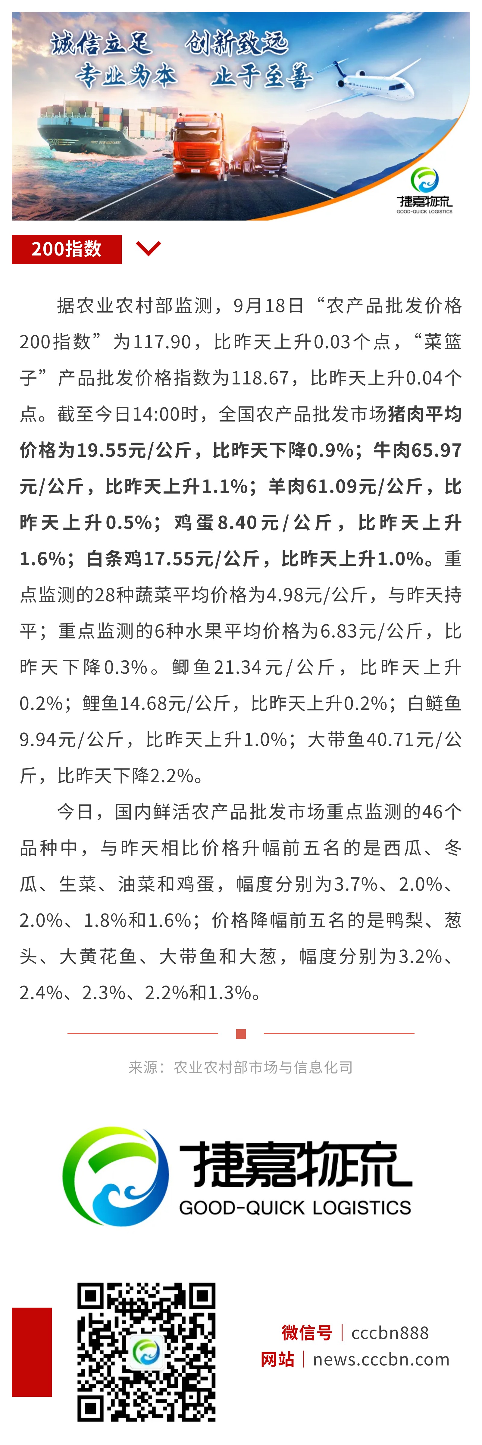 9月18日:“农产品批发价格200指数”比昨天上升0.03个点