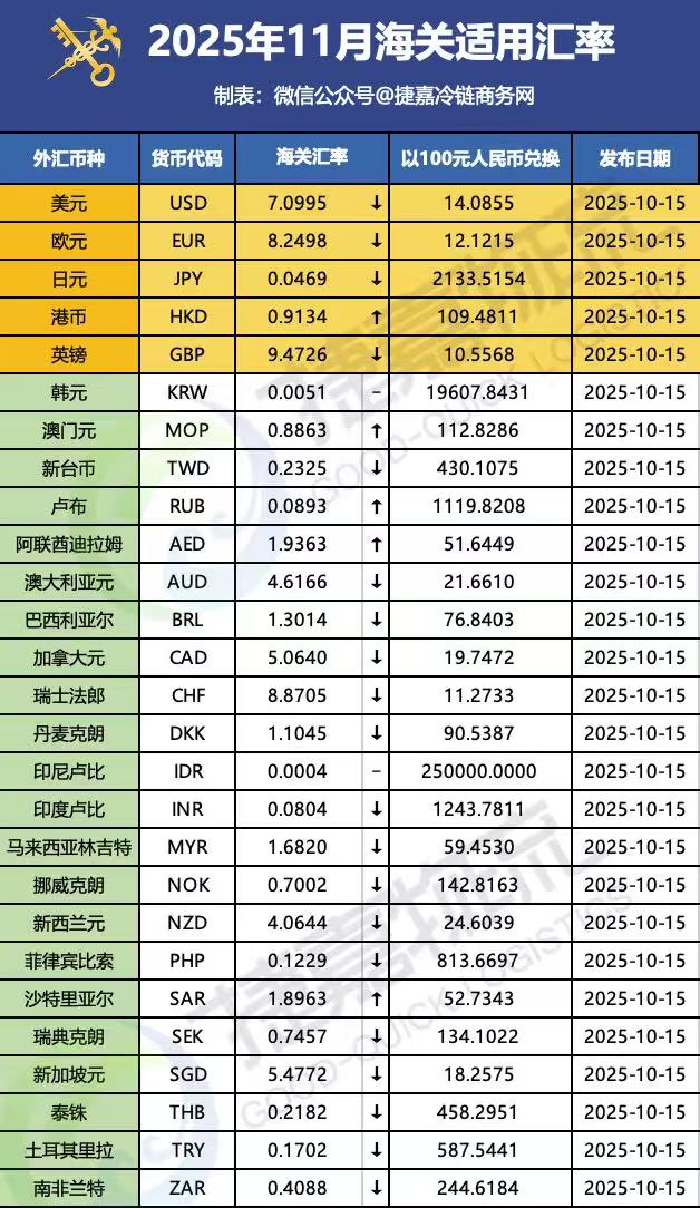 根据《中华人民共和国海关进出口货物征税管理办法》(海关总署令2005年第124号)第十六条的规定,海关每月使用的计征汇率为上一个月第三个星期三(第三个星期三为法定节假日的,顺延采用第四个星期三)中国人民银行公布的外币对人民币的基准汇率;