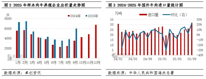 当前市场呈现国内出栏与国外进口“双增”格局,共同推动牛肉总体供应放量,前期存在的供应缺口正显著收窄。国内方面,前期产能出清效应显现,推动2025年肉牛价格进入回暖周期。市场看涨预期强化,直接刺激了中短期育肥行为的增加。同时,行业步入9-10月传统出栏高峰,季节性供应持续释放。据卓创资讯数据监测,截至9月底,样本企业肉牛出栏量达0.60万头,环比增加56.25%,同比增幅高达68.54%。尽管能繁母牛存栏的长期恢复仍显缓慢,但市场通过增加育肥量,已对短期供应形成了有效补充。