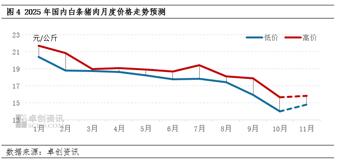 综合来看,白条猪肉价格在短期有望实现触底回升,但供过于求的现状只是边际缓解,供应压力未从根本解决。伴随季节性消费的到来,猪肉价格有望迎来阶段反弹。预计11月份白条猪肉价格运行区间在14.80-15.80元/公斤。