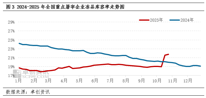 10月冻品库容率呈增加的走势,且幅度较为明显。截至10月末,卓创资讯监测全国重点屠宰企业冻品库容21.75%,较9月增加个2.73百分点,较去年同期增加1.75个百分点。