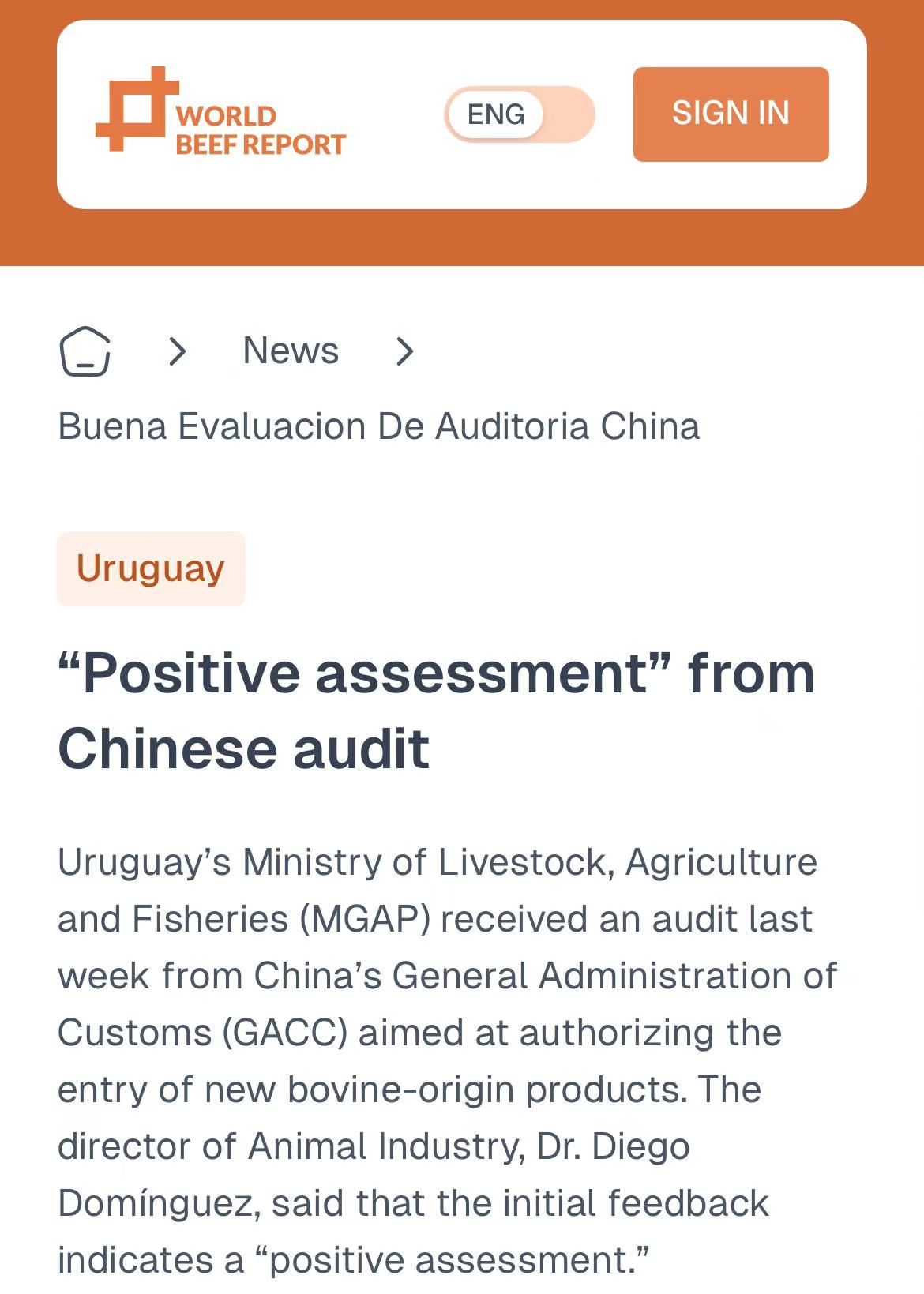 上周,乌拉圭牧农渔业部(MGAP)接待了中国海关总署(GACC)的技术审计团,旨在推动乌拉圭新型牛源性产品进入中国市场。据乌拉圭动物产业局局长迭戈·多明格斯博士透露,此次审计初步反馈良好,中方对乌方相关体系表示认可。