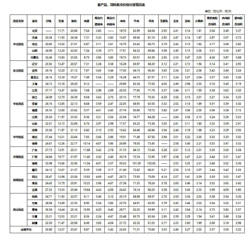 全国仔猪平均价格25.80元/公斤,同比跌29.1%,环比跌14.2%。从涨跌情况看,全国29个监测省份价格均下跌。其中,华中地区环比跌幅较大,湖南领跌,跌幅为19.9%。从价格水平来看,华南地区仔猪平均价格最高,为28.85元/公斤;华北地区最低,为24.65元/公斤。