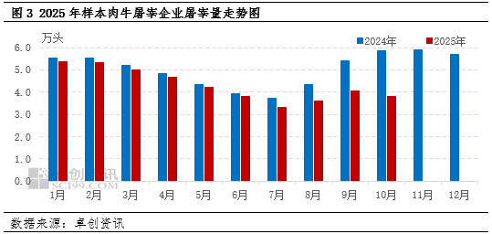 牛肉消费的疲软是本轮价格回调的重要影响因素。据卓创资讯数据显示,截至10月,卓创资讯监测肉牛样本屠宰量为3.81万头,环比下滑6.39%。部分头部企业宰量下滑幅度明显。屠宰企业普遍面临"收购顺畅、销售不畅"的困境,部分企业已通过减少屠宰班次等方式调整生产计划。