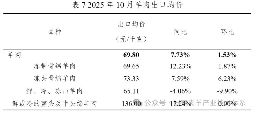 中国羊肉的出口均价为69.80元/千克,同比增长7.73%,环比增长1.53%。冻带骨绵羊肉出口均价为69.65元/千克,同、环比分别增长12.23%和1.87%。冻去骨绵羊肉的出口均价为73.33元/千克,同比增长7.59%,环比增长6.23%。鲜、冷、冻山羊肉、鲜或冷的整头及半头绵羊肉的出口均价分别为65.11元/千克和136.00元/千克(如表7示)。