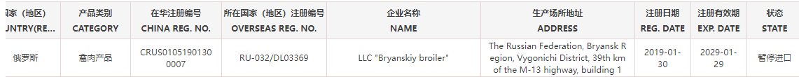 暂停受理俄罗斯2家禽肉产品(注册编码为:RU-032/DL03369、RU-021/MP06430)自2025年11月27日(含)起启运的输华产品进口申报。
