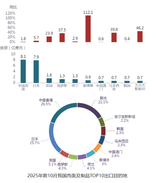 市场方面,前10个月,我国肉类及制品出口额排名前十的国家/地区分别为中国香港、日本、英国、俄罗斯、荷兰、柬埔寨、中国澳门、马来西亚、韩国、吉尔吉斯斯坦,合计占我国该产品出口额的77.9%。