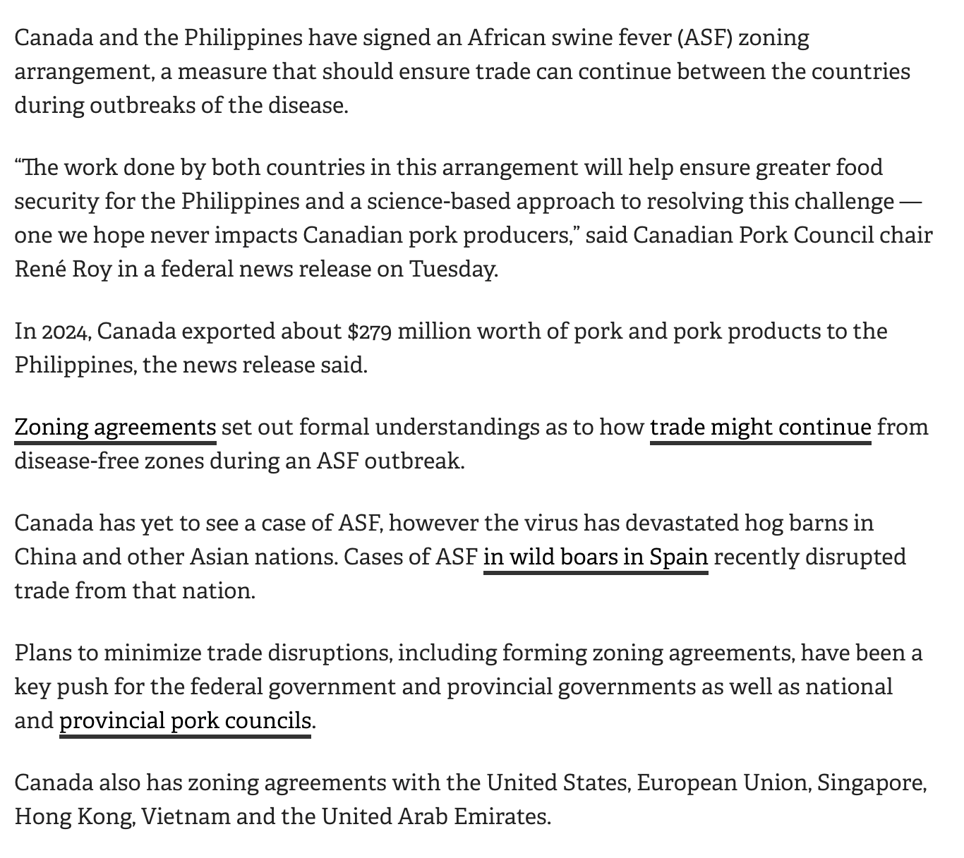 加拿大猪肉委员会主席雷内·罗伊(René Roy)周二在联邦新闻稿中表示:“该协议的签署将有助于保障菲律宾的粮食安全,并以科学方式应对疫情挑战——我们期望非洲猪瘟永远不会影响加拿大猪肉生产商。”