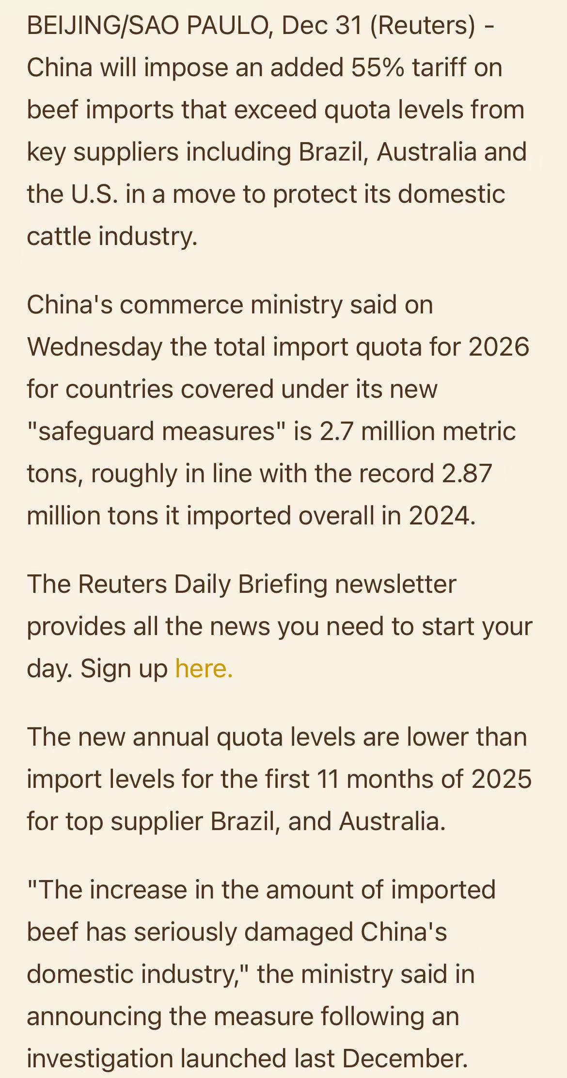除巴西外,阿根廷、乌拉圭、澳大利亚等主要供应国均将受到配额管理。巴西政府表示已关注该政策,将通过双边与WTO渠道与中方沟通。行业分析指出,55%的关税将使配额外出口在经济上难以持续,同时后续进口监管与信贷政策若收紧,可能进一步影响贸易流动。