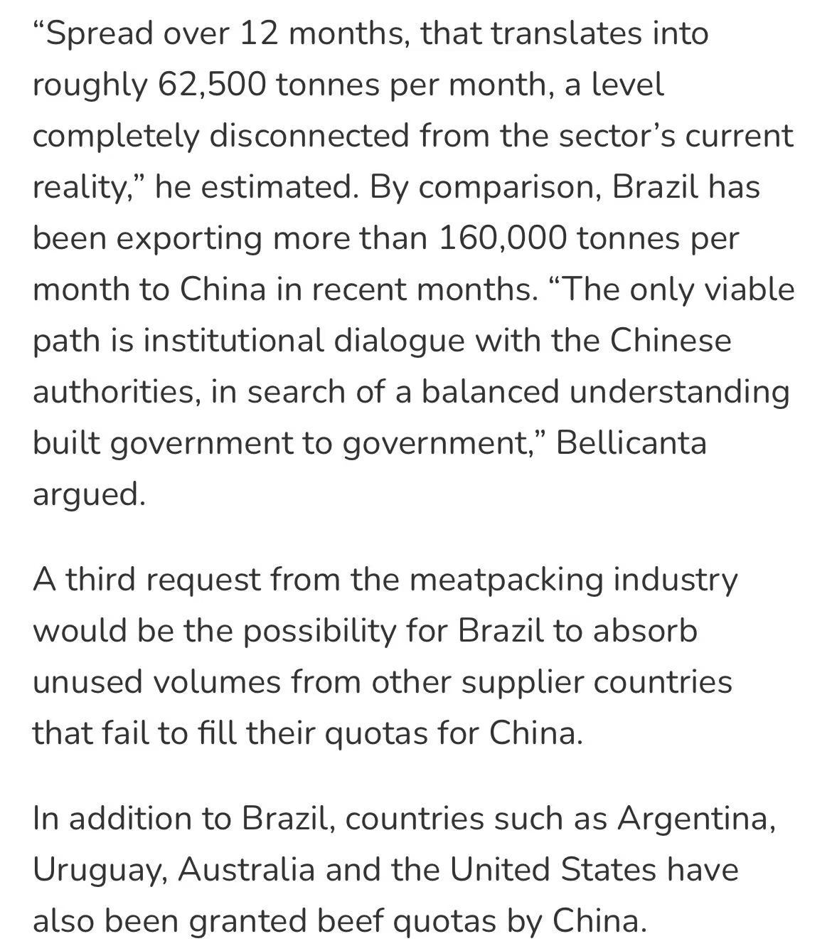 此外,巴西希望在中方允许下,承接阿根廷、乌拉圭等其他供应国未用完的配额。巴西农业部已表示将通过对话推进此事,并强调巴西牛肉具备价格与品质优势,有助于平抑中国国内通胀。目前巴西暂不考虑向世贸组织提起诉讼,倾向于以协商方式处理配额相关事宜。