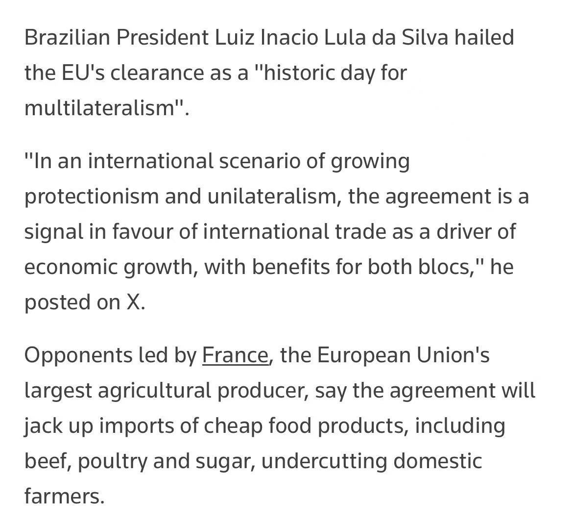 在历经四分之一世纪的艰难谈判后,欧盟与南美南方共同市场(Mercosur)的自由贸易协定终于冲破最后一道内部障碍。尽管法国等国因担心冲击本土农业而激烈反对,欧盟多数成员国仍在1月9日投票支持,为这项划时代协议的签署扫清道路。